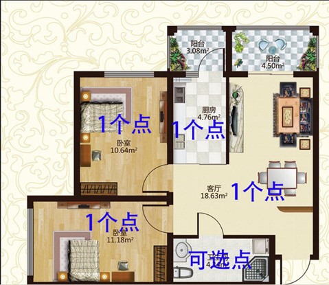各個房間面積小于50㎡,各設一個點;房間面積在50-100㎡,需設二個點