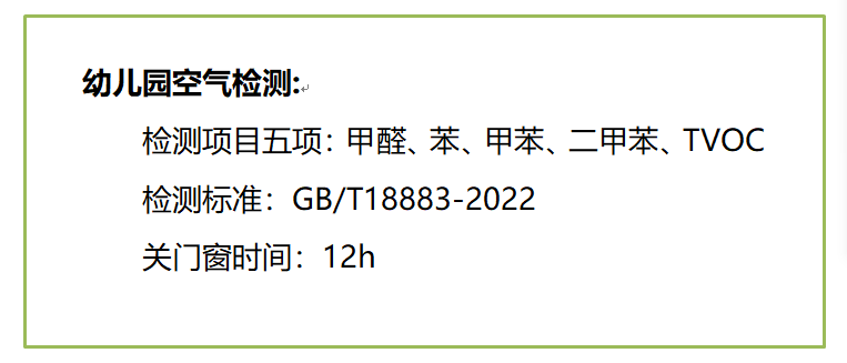 家庭空氣檢測、幼兒園空氣檢測、辦公室甲醛檢測自看等適用檢測標準:GB/T 18883-2022